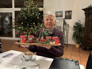 Ein Highlight im Saal: Unsere Vorsitzende erhielt ein liebevoll gestaltetes Adventsgesteck – ein Geschenk, das den Raum sofort noch wärmer wirken ließ. Ein stiller, schöner Moment mitten im Weihnachtstrubel.
