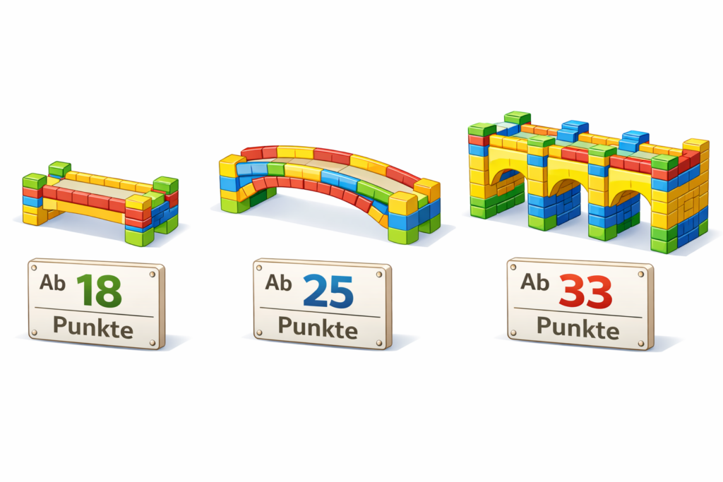 Wer viel hat, kann teuer bauen … Mit 18 Punkten reichte es nur für eine kleine Brücke. Wer beim Schlemm richtig abräumen will, sollte auch reichlich Punkte haben.