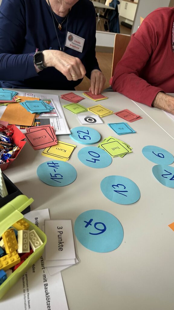 Statt Karten gab es farbige Papierquadrate – grün für Treff, gelb für Karo, rot für Coeur und blau für Pik. Dazu ein Stapel Punkte (insgesamt 40), aus dem sich jede und jeder bediente. Dazu schauten wir uns die magischen Zahlen an.